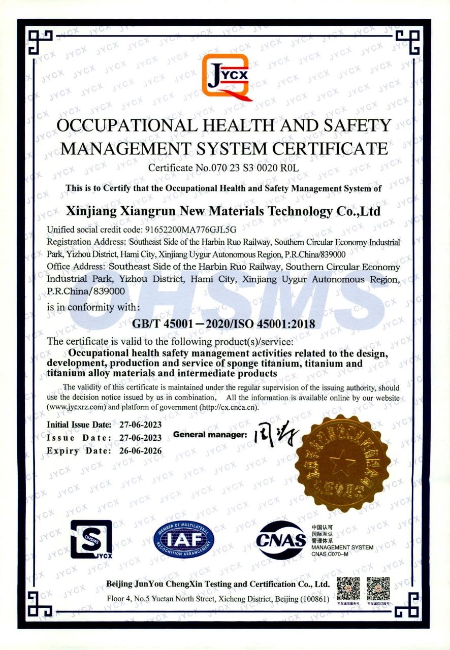 职业健康安全管理体系认证证书(中文)